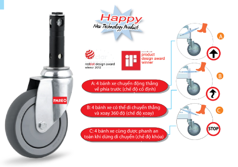 + Đẩy cần khóa (A) lên khi muốn cả 4 bánh xe chỉ chuyển động thẳng về phía trước (như bánh xe càng cố định)