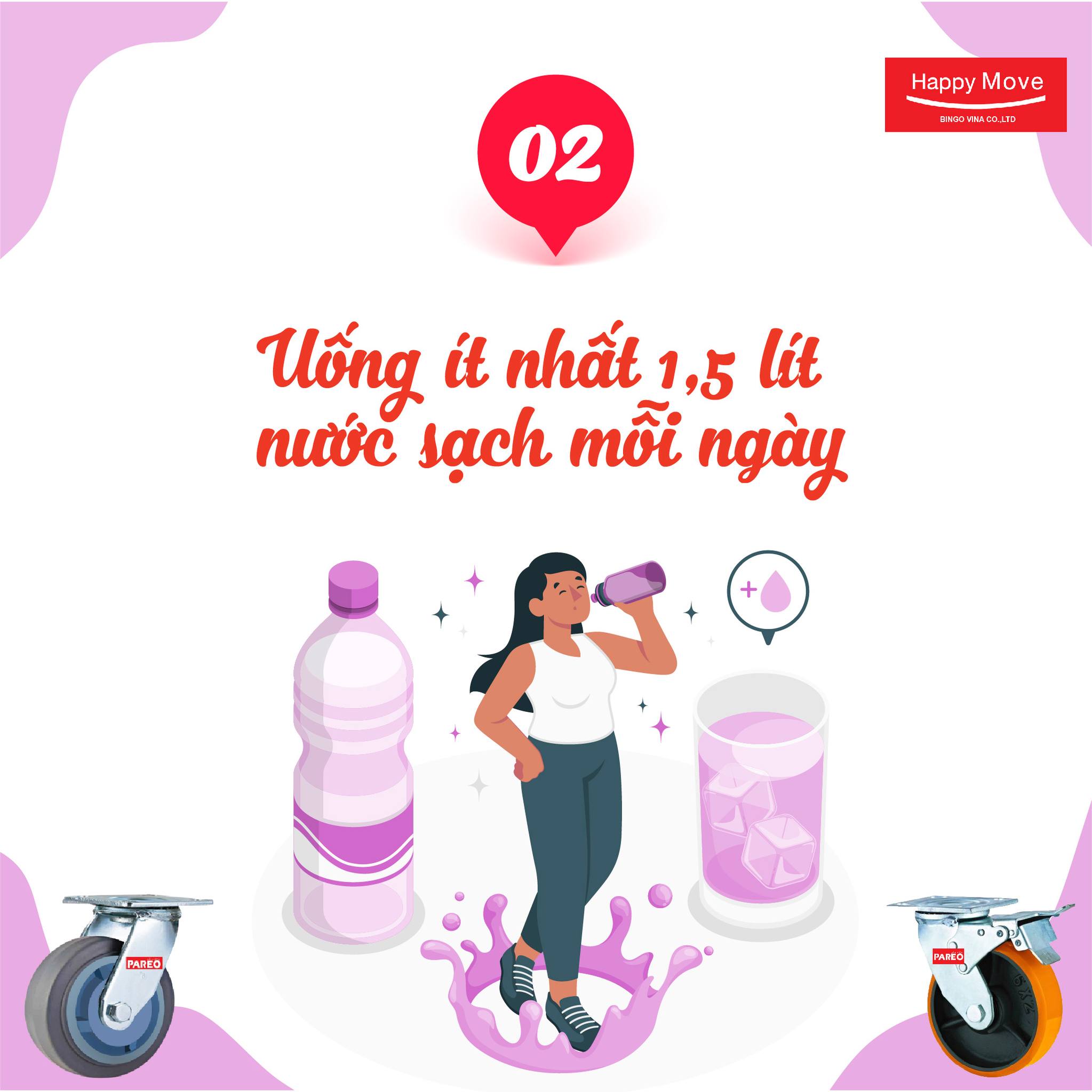 2. Uống ít nhất 1,5 lít nước sạch mỗi ngày để duy trì sự cân bằng của cơ thể. Tăng lưu thông máu và làm cho các tế bào bên trong cơ thể không bị mất nước.