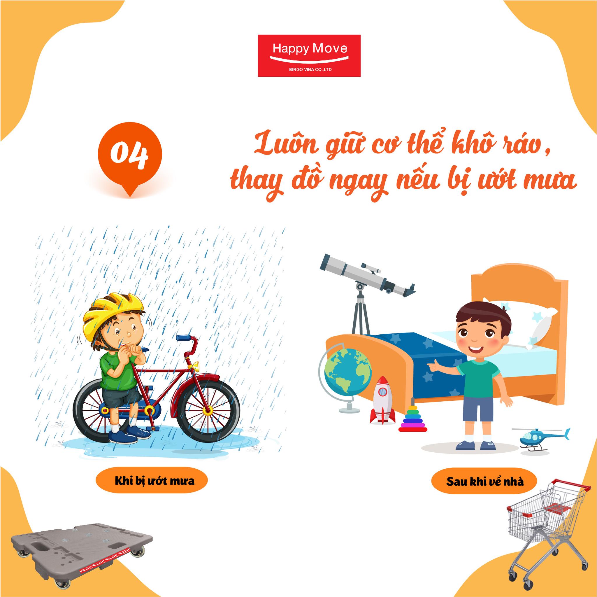 4. Luôn giữ cơ thể khô ráo, khi đi mưa ướt phải thay quần áo ngay. Để giữ ấm cho cơ thể, giảm nguy cơ viêm phổi hoặc bệnh ngoài da.