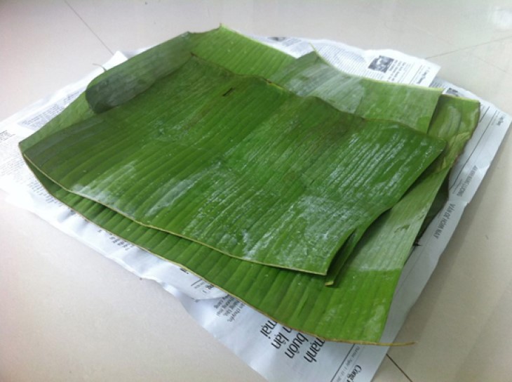 Tiếp đến, bạn trải lá chuối lên một mặt phẳng lớn như mâm, khay, mặt bàn sạch. Xếp 2 miếng lá chuối cạnh nhau (như hình tàu lá chuối ban đầu khi chưa rọc), xếp thêm 1 miếng vào giữa.