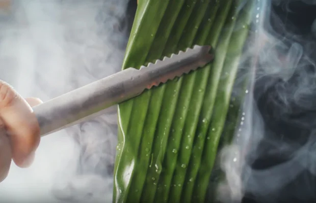 Tiếp theo, bạn rửa lá chuối, tước bỏ phần sống lưng lá, chia lá chuối thành những miếng dài khoảng 60cm, cuốn lại thành cuộn nhỏ. Lưu ý, bạn cần nhẹ tay để không làm lá chuối bị rách.