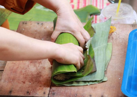 Sau đó, bạn gói lớp lá chuối ở giữa để cố định hình dáng gạo, tiếp theo dùng 2 lớp lá chuối bên ngoài cuộn chặt lại, gấp 2 bên mép để tạo thành một chiếc bánh hoàn chỉnh. Các thao tác cuộn lá chuối, gấp mép phải thật chắc tay để bánh chặt và đẹp.