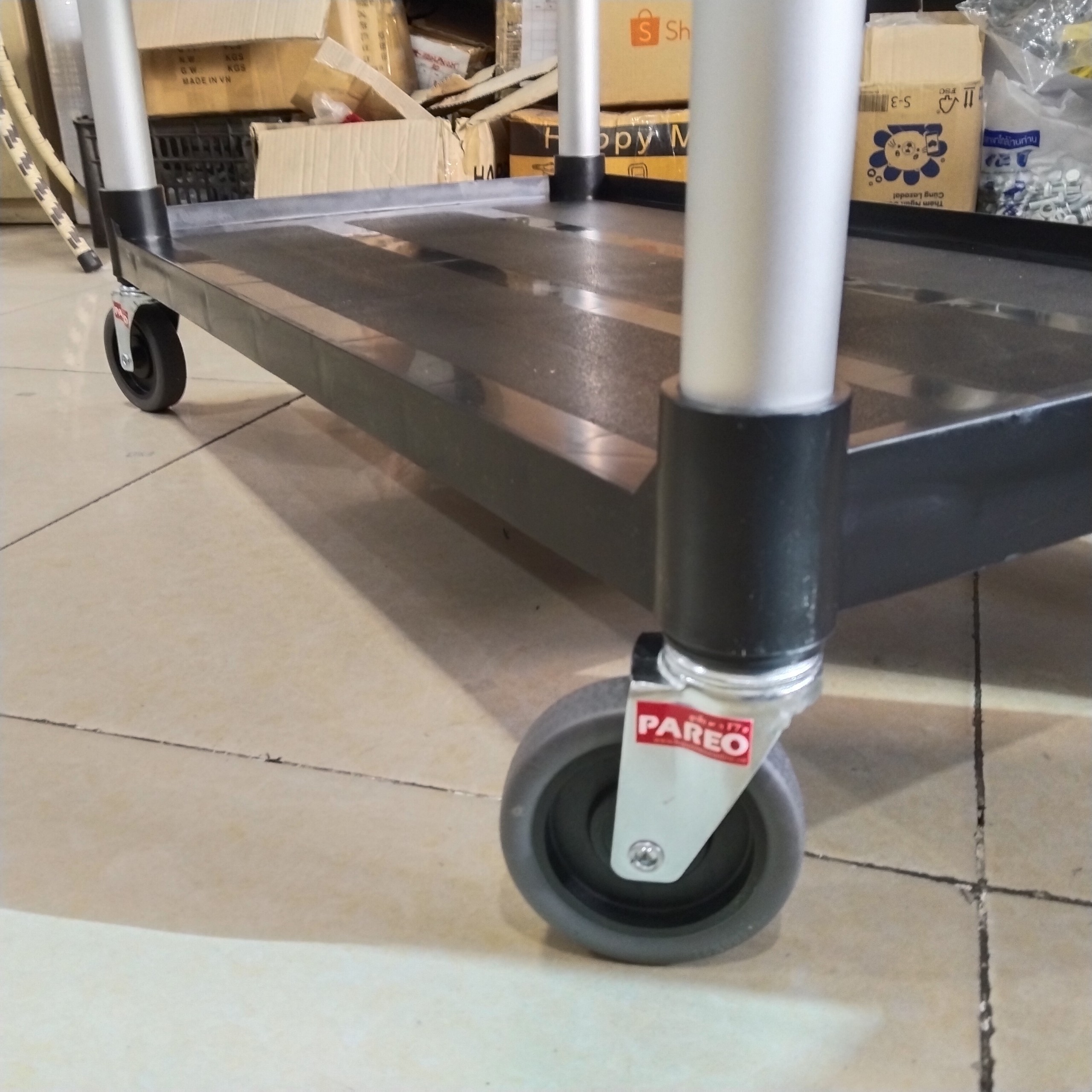 - Xe đẩy được cấu thành từ 2 chất liệu chính là khung nhôm và tấm kệ tại mỗi tầng bằng nhựa. Chất liệu cao cấp giúp xe cứng cáp, chịu được trọng lượng nặng mà không bị cong vênh.