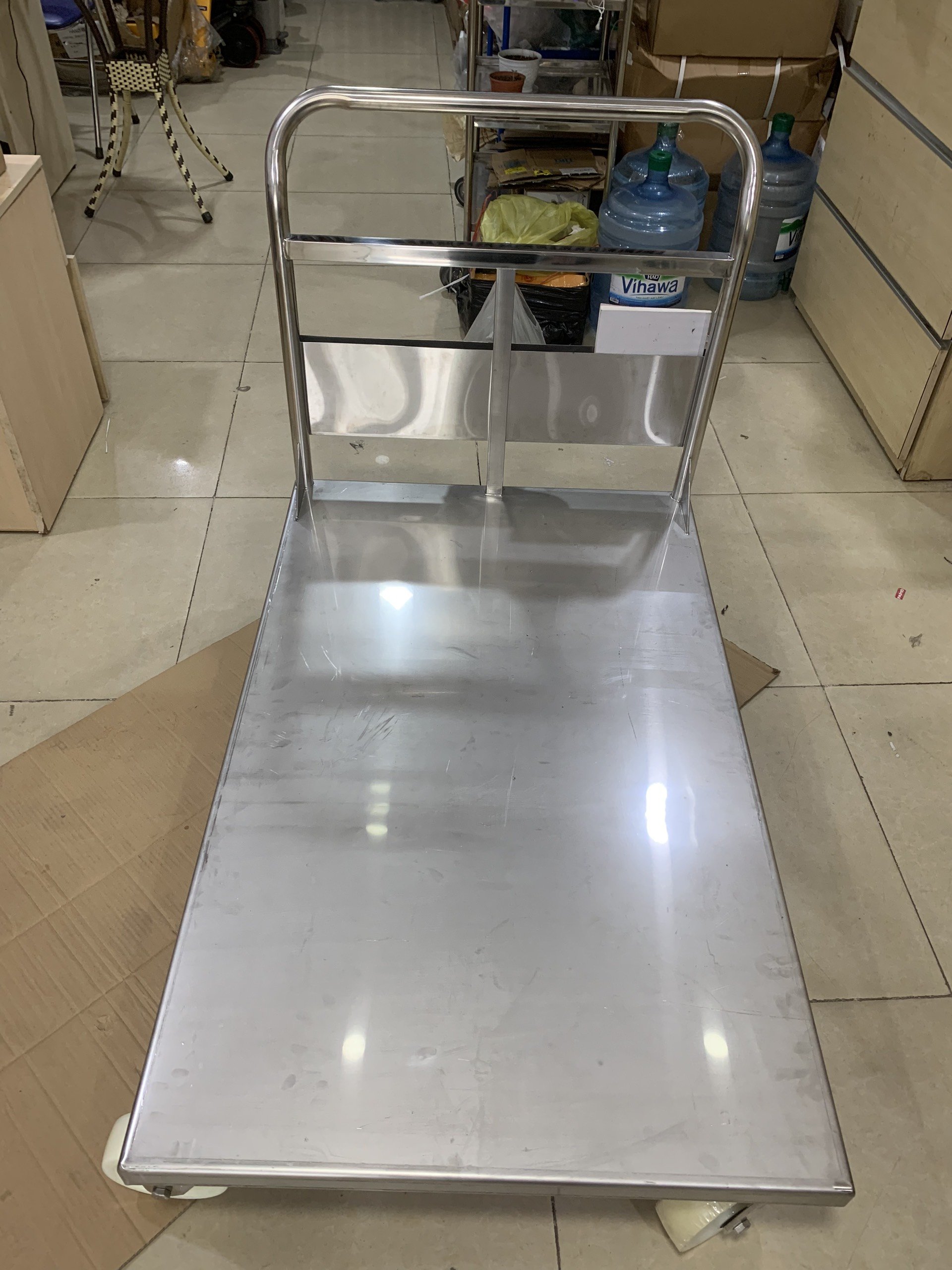 + Xe đẩy inox, thùng nhựa để vận chuyển rau. Trái cây được giao đến các cửa hàng khác nhau. Bạn cũng có thể gắn nó vào phía sau xe bán tải để giao hàng. Nếu xe bị bẩn có thể dễ dàng rửa sạch, xe không bị gỉ sét.