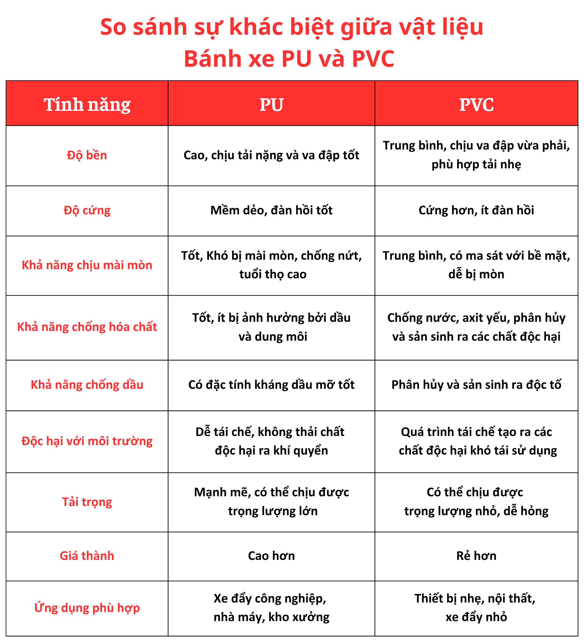 Bánh xe PU được yêu thích vì có độ bền vượt trội, chịu tải tốt, chống mài mòn và giảm tiếng ồn hiệu quả. PU cũng có khả năng chịu dầu, hóa chất và nhiệt độ cao hơn so với PVC.