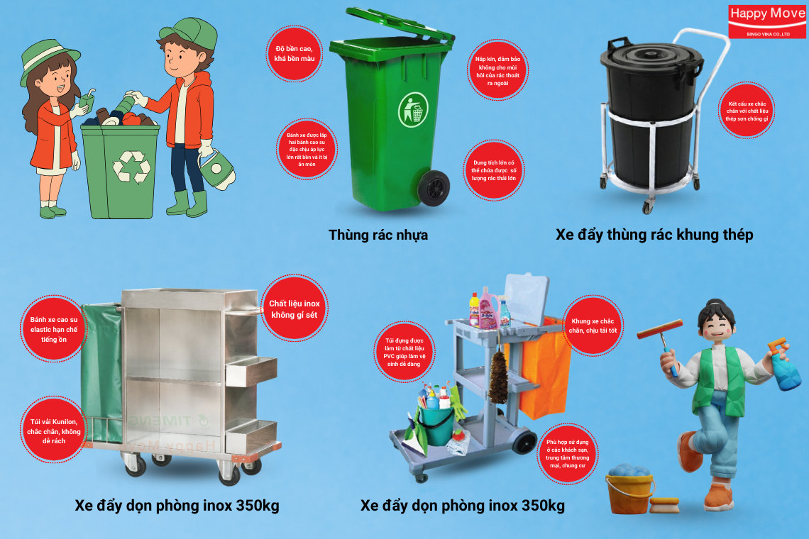 Các sản phẩm thường thấy: Chai sữa, chai dầu gội, chai chất tẩy rửa, túi nhựa dày, thùng rác