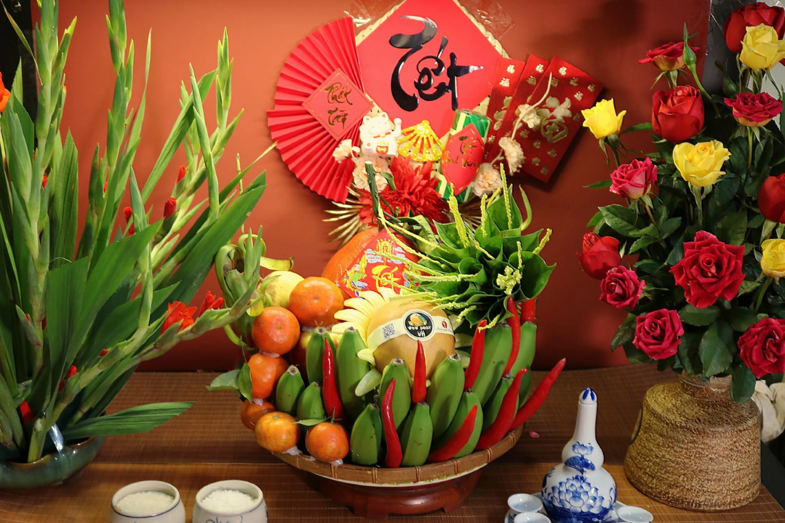 Hoa đào, hoa mai, cây quất hay cúc Tết là những hình ảnh không thể thiếu trong ngày xuân. Mỗi loài hoa đều mang ý nghĩa riêng, tượng trưng cho tài lộc, may mắn, hạnh phúc và khởi đầu mới tốt đẹp. Bên cạnh đó, mâm ngũ quả đặt trên bàn thờ tổ tiên thể hiện ước vọng đủ đầy, sung túc, cầu mong mưa thuận gió hòa, gia đình bình an trong năm mới.