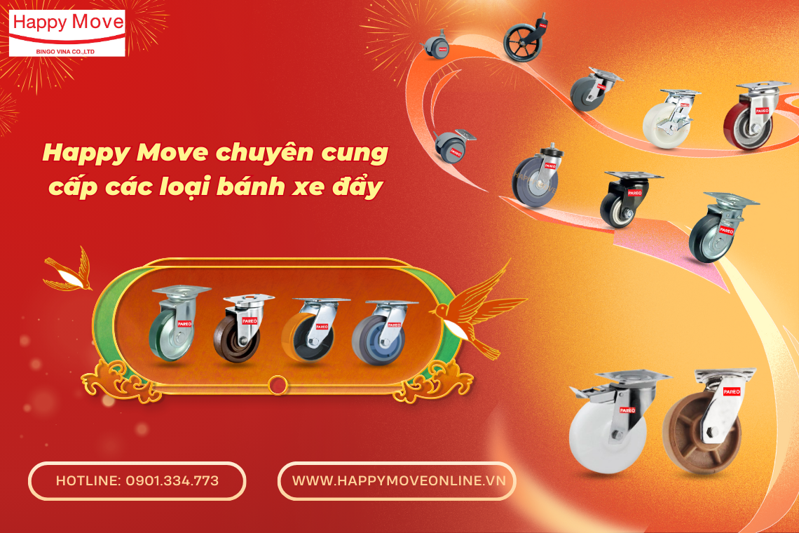 Happy Move VN cung cấp hàng hóa chất lượng cao, đa dạng tải trọng, đa dạng chất liệu, từ bánh xe chịu nhiệt, chống tĩnh điện, bánh xe công nghiệp tải nhẹ, tải nặng đến siêu tải cho đến xe đẩy inox chống gỉ, xe nâng phù hợp với kho lạnh hay nhà máy sản xuất. Sản phẩm của chúng tôi bền bỉ, dễ sử dụng, giúp tối ưu vận chuyển và nâng cao hiệu quả làm việc.