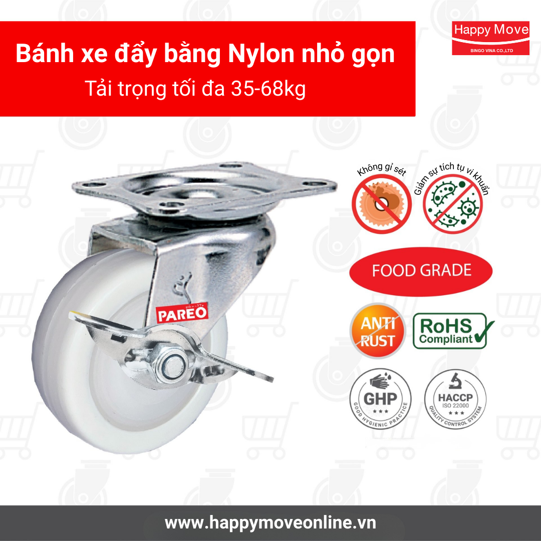 BÁNH XE ĐẨY NYLON CÀNG INOX 304, BÁNH XE CHO NHÀ MÁY THỰC PHẨM, DƯỢC PHẨM,...- PAREO