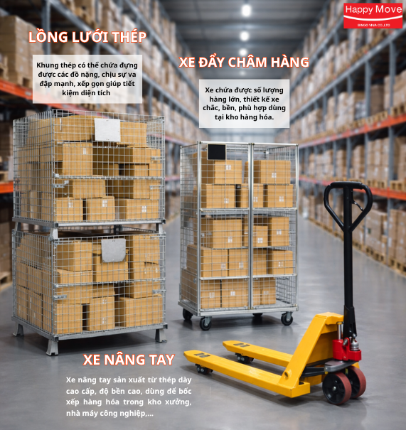 Xe nâng pallet kết hợp với lưới thép.: Sự kết hợp này giúp di chuyển các khối lượng hàng lớn một cách ổn định, bảo vệ hàng hóa không bị rơi rớt trong quá trình vận chuyển.